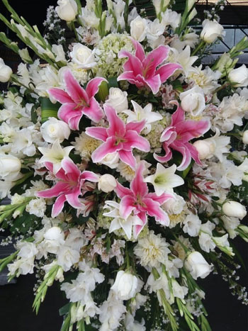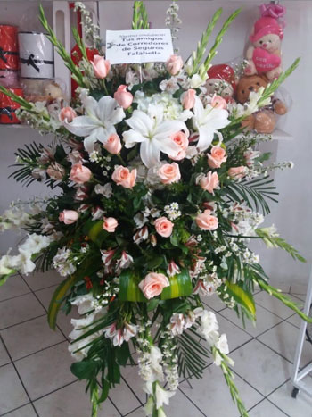 Lágrima funebre con rosas, rosadas lilium blanco, complementado con otros detalles de lindas flores y finos follajes