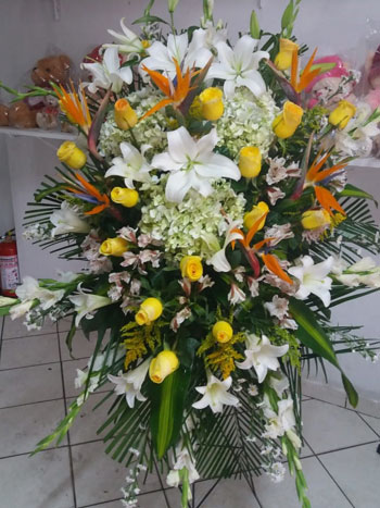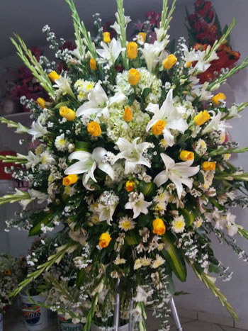 La cruz fúnebre tiene 2 m de alto ,se elabora con rosas amarillo importadas,lilium, complementado con otros detalles de flores y finos follajes