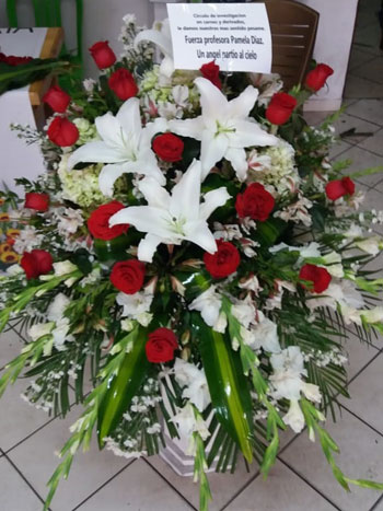 Lágrima funebre con rosas, rojas lilium blanco, complementado con otros detalles de lindas flores y finos follajes