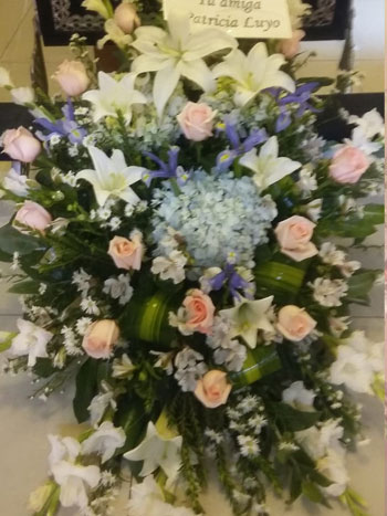 La cruz fúnebre tiene 2 m de alto ,se elabora con rosas azules importadas,lilium , complementado con otros detalles de flores y finos follajes